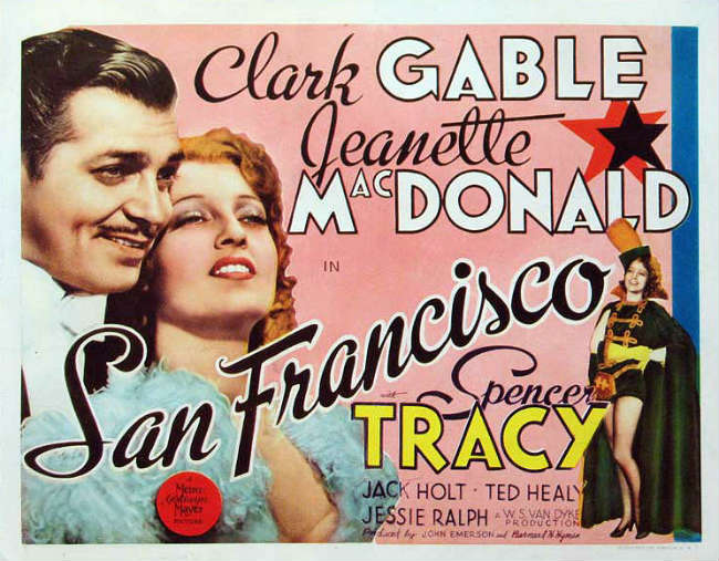 For most of its 115 minutes, San Francisco is a generally unbelievable struggle of good vs. evil, classical music vs. modern music, and love vs. exploitation. It stars Clark Gable well on his way to becoming the “King of Hollywood,” soprano Jeanette MacDonald at her height of popularity, and Spencer Tracy right before his back-to-back Oscars for his films in 1937 and ’38. In fact, this film gave him his first Oscar nomination for Best Actor (Paul Muni won that year for The Story of Louis Pasteur), though the case can be made that he should have been nominated in the new Best Supporting Actor category. But his effect on the film is strong. He’s playing a priest and long-time friend of Gable’s Blackie Norton; Tracy supplies a firm strong sense of morality throughout when others are either wavering ethically or simply choosing to be the bad guys (e.g., Norton), and his presence is onscreen even when he isn’t.